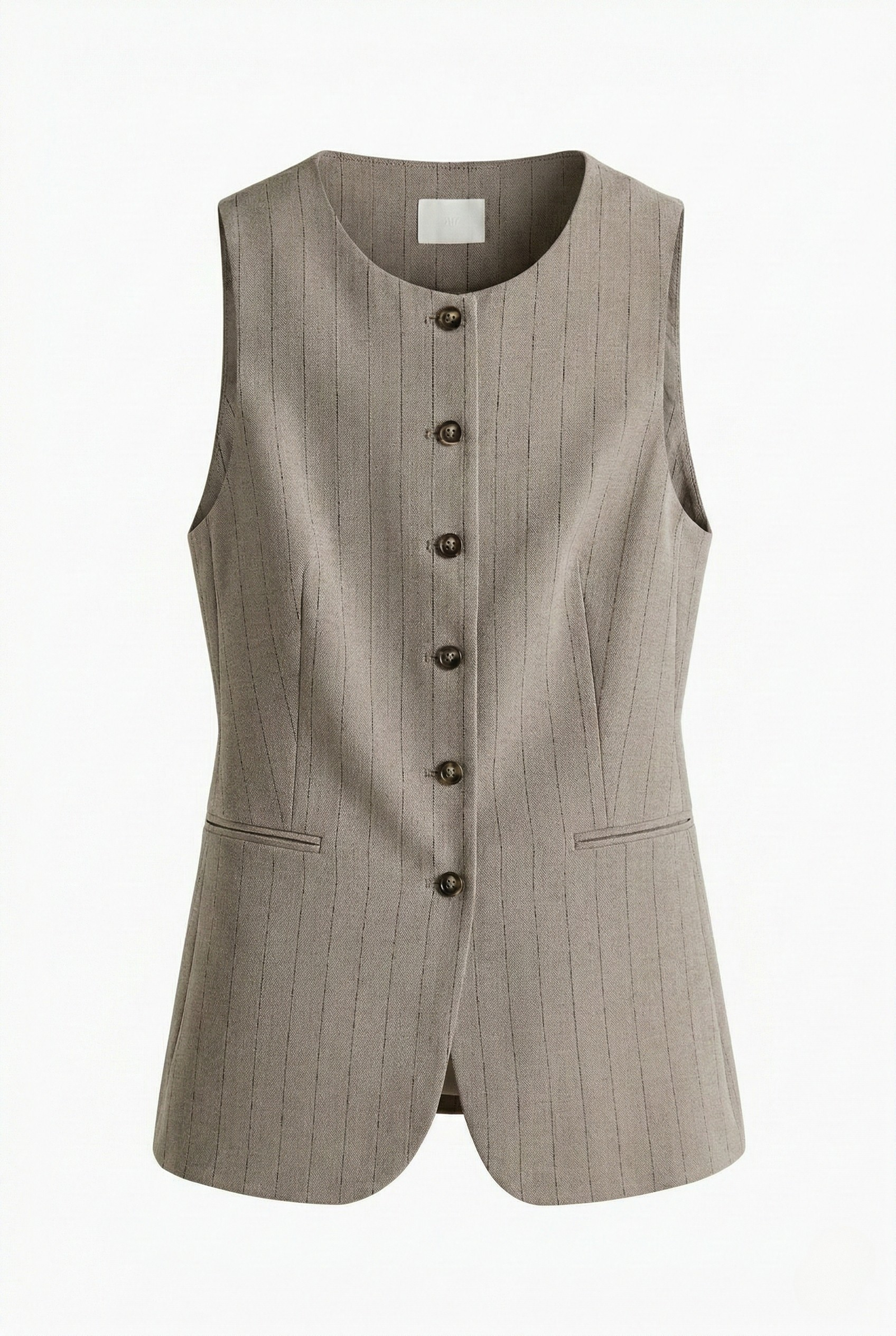 Long, fitted suit waistcoat in woven fabric with a round neckline and buttons at the front. Shaping darts at the waist, jetted front pockets, and a single back vent. Lined.