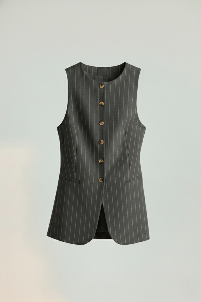 Long, fitted suit waistcoat in woven fabric with a round neckline and buttons at the front. Shaping darts at the waist, jetted front pockets, and a single back vent. Lined.