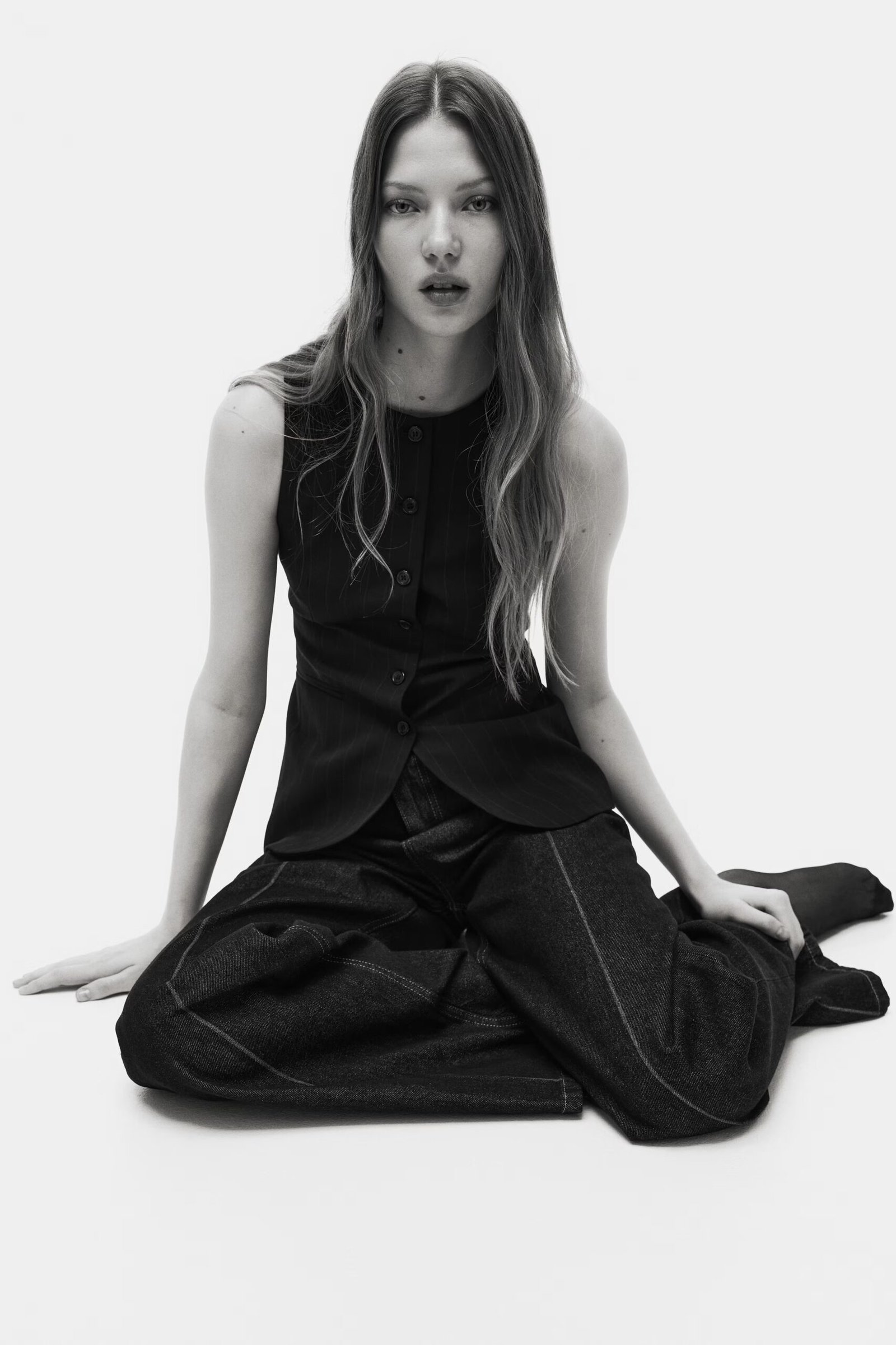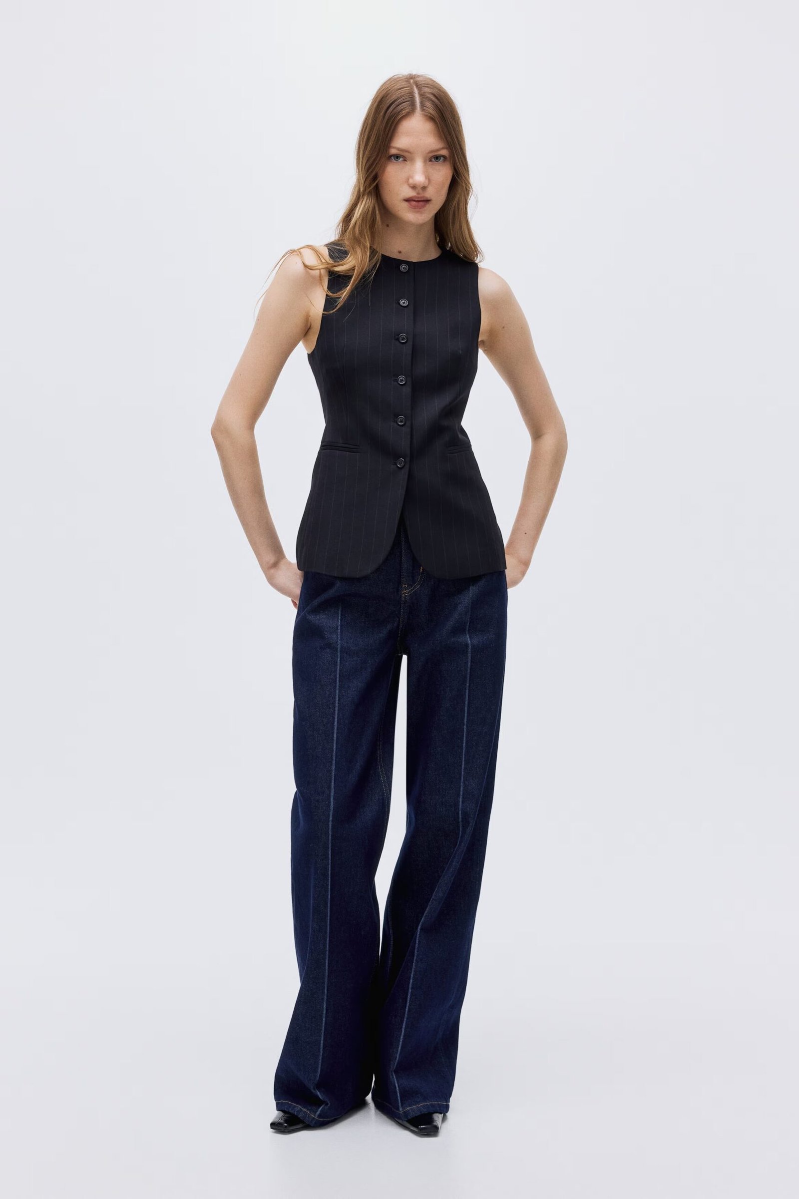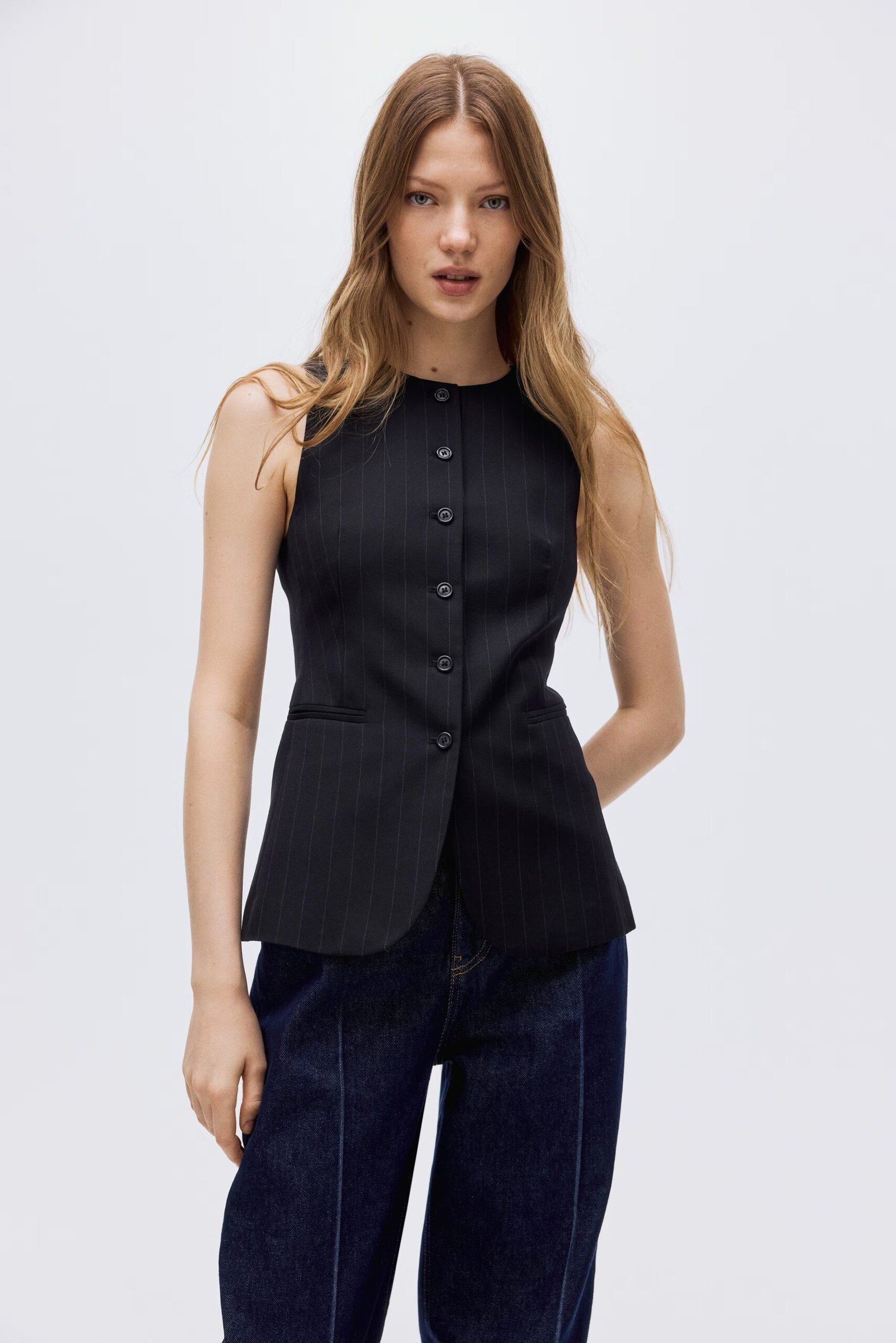 Long, fitted suit waistcoat in woven fabric with a round neckline and buttons at the front. Shaping darts at the waist, jetted front pockets, and a single back vent. Lined.