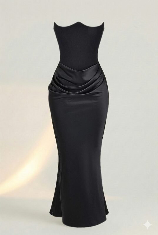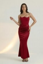 A striking, strapless red maxi dress featuring a structured corset bodice that sculpts the silhouette. The design is enhanced with elegant ruching at the waist and hips, creating a flattering, hourglass shape. Ideal for formal events or glamorous evening occasions.