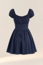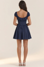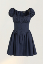 This blue dress exudes romantic elegance with its corset-style bodice and soft, flowing skirt. Featuring a flattering square neckline and ruched puff sleeves, it enhances the silhouette while maintaining a playful charm. The fitted waist with button detailing creates a cinched effect, highlighting the natural curves, and the mini length adds a youthful, breezy touch—perfect for garden parties, dates, or special summer outings.