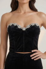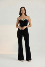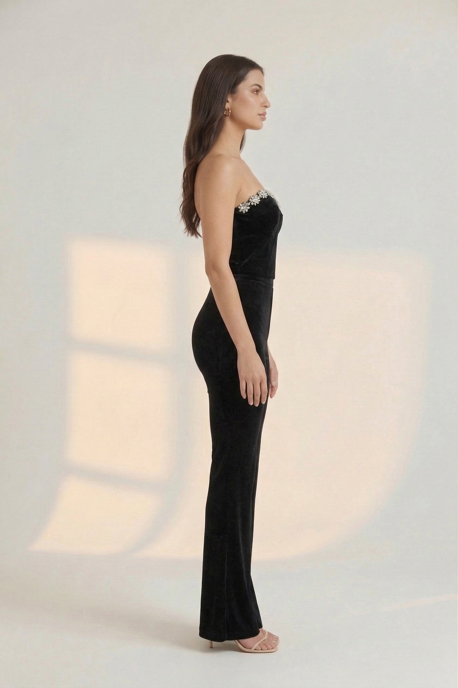 This outfit features a chic and sophisticated black velvet strapless co-ord set with a sweetheart neckline adorned with crystal embellishments. The figure-hugging bodice flows into flared pants, creating a flattering and elongating silhouette. Perfect for glamorous evening events, upscale dinners, or holiday parties, this piece can be styled with statement earrings, a sleek clutch, and strappy stilettos. Add a faux fur stole or tailored blazer for added elegance and warmth during colder evenings.