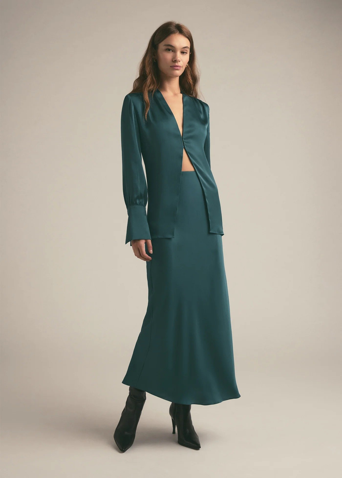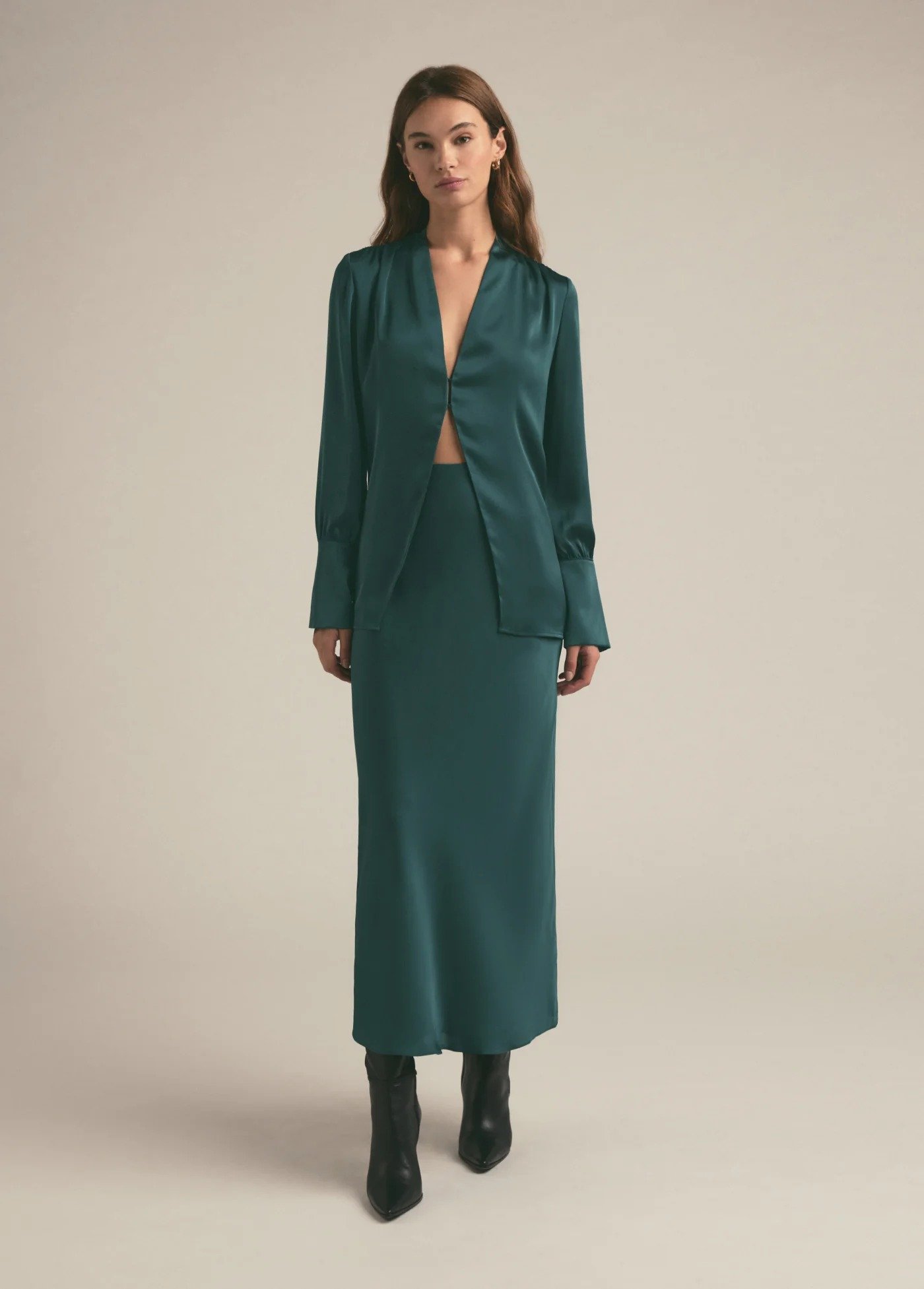 The Luna Skirt is an elegant full-length piece crafted from luxurious crepe satin that drapes beautifully and flatters the figure. Its high-waisted silhouette and fluid finish create a sleek, sophisticated look perfect for both day and night. Style it with a structured blouse or a satin cami, add gold jewelry, and finish with heels or embellished flats. Ideal for evening events, formal dinners, art shows, or upscale workwear.