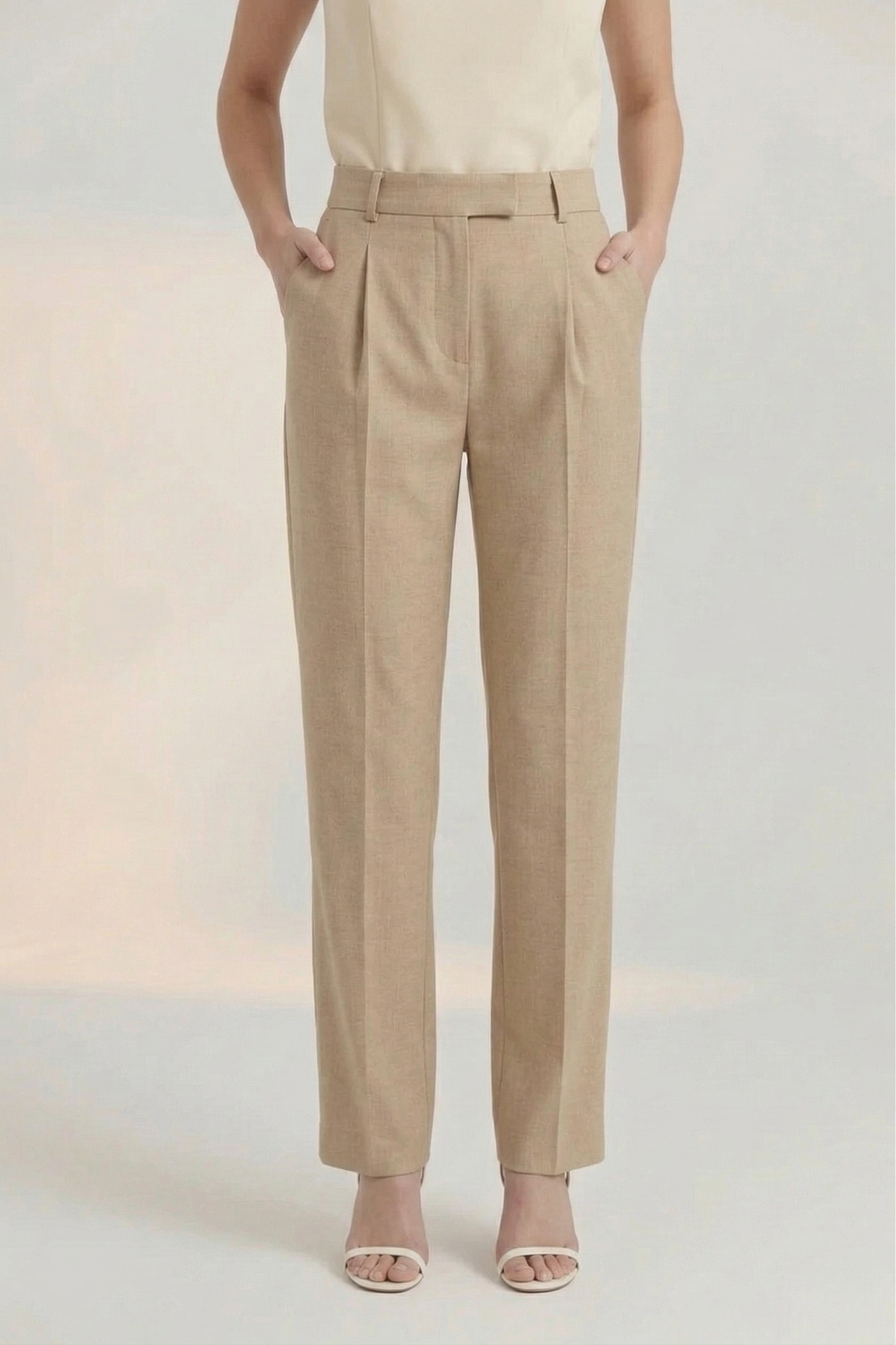 These wide-leg, high-waisted banana crepe trousers feature front pleats with a concealed button and hook-and-bar fastener, diagonal side pockets, welt back pockets, and a relaxed, airy fit—perfect for warm-weather dressing. Style them with a tank top for a casual look, a blouse for something more polished, or a matching blazer for a minimalist vibe. Ideal for brunch, beach getaways, summer office days, or relaxed social outings.