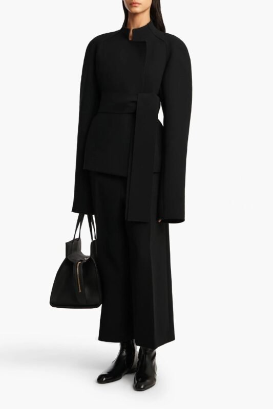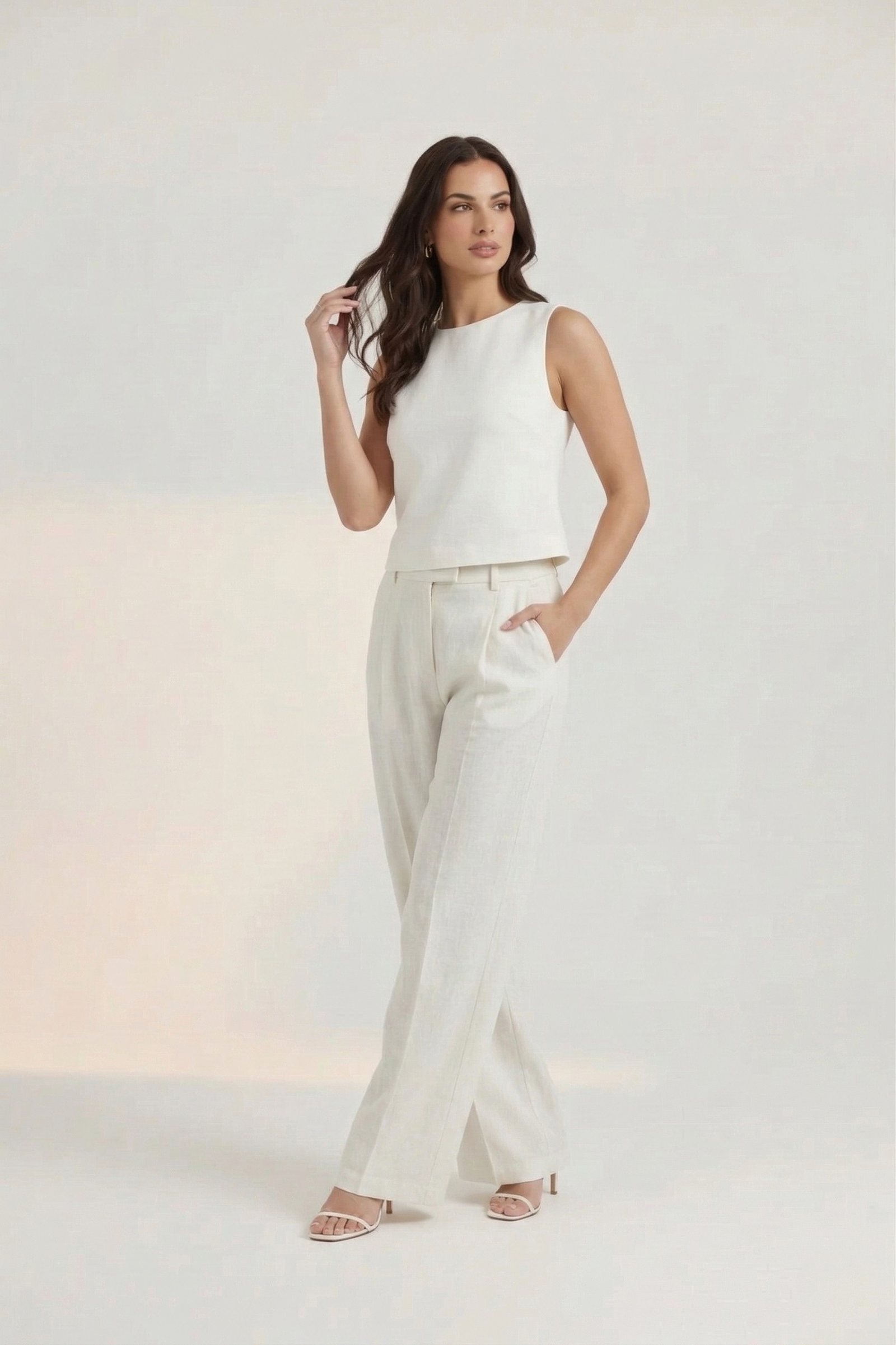 These wide-leg, high-waisted banana crepe trousers feature front pleats with a concealed button and hook-and-bar fastener, diagonal side pockets, welt back pockets, and a relaxed, airy fit—perfect for warm-weather dressing. Style them with a tank top for a casual look, a blouse for something more polished, or a matching blazer for a minimalist vibe. Ideal for brunch, beach getaways, summer office days, or relaxed social outings.