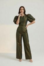 This top is crafted from a lustrous fabric, features voluminous puff sleeves, and has a single decorative button for a touch of elegance. Perfect for brunches, gallery visits, or chic office looks, it pairs beautifully with tailored trousers, midi skirts, or wide-leg jeans for a refined yet feminine ensemble.