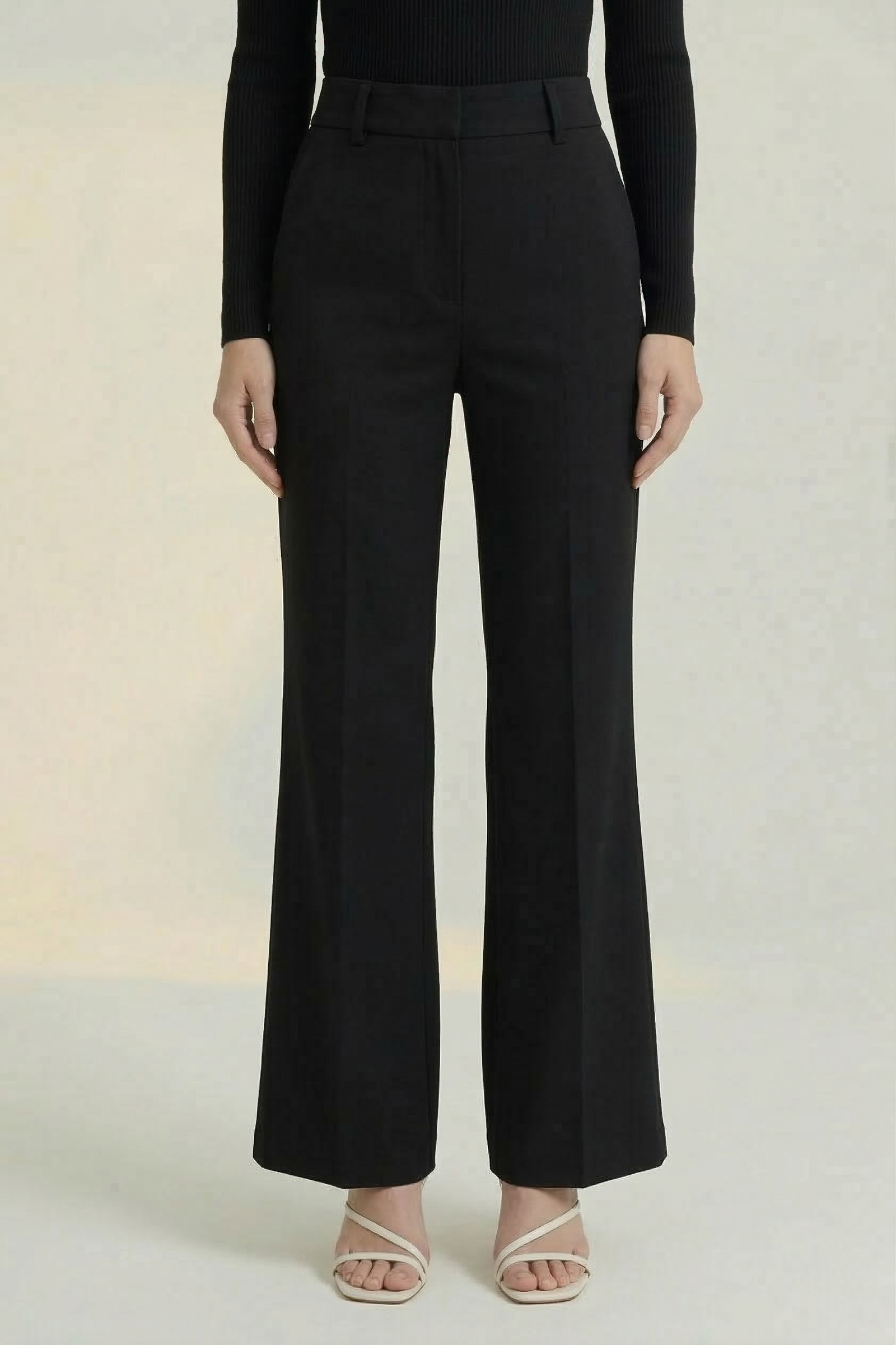 The Ramona Flare Pants are tailored for polish and comfort, crafted from wrinkle-resistant two-way stretch fabric that moves with you. Designed with a sleek flat waistband and mid-rise fit, they flare from above the knee to elongate the legs. Featuring side pockets and a slim silhouette, these pants are perfect for both office days and elevated casual looks. Machine wash cold or dry clean; shape to dry.