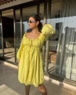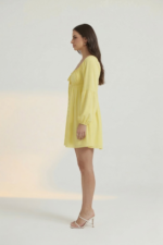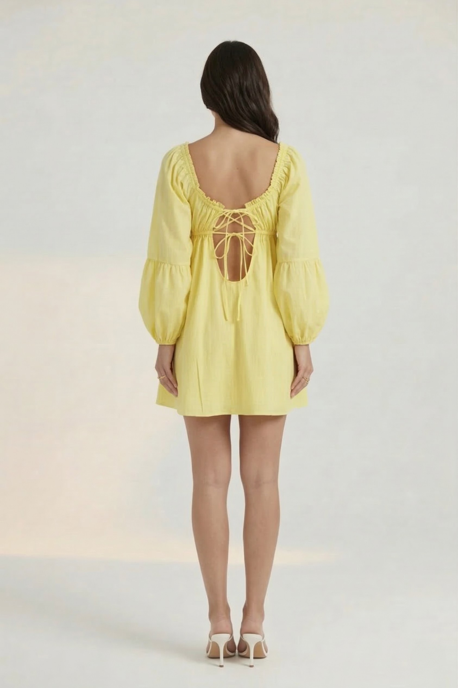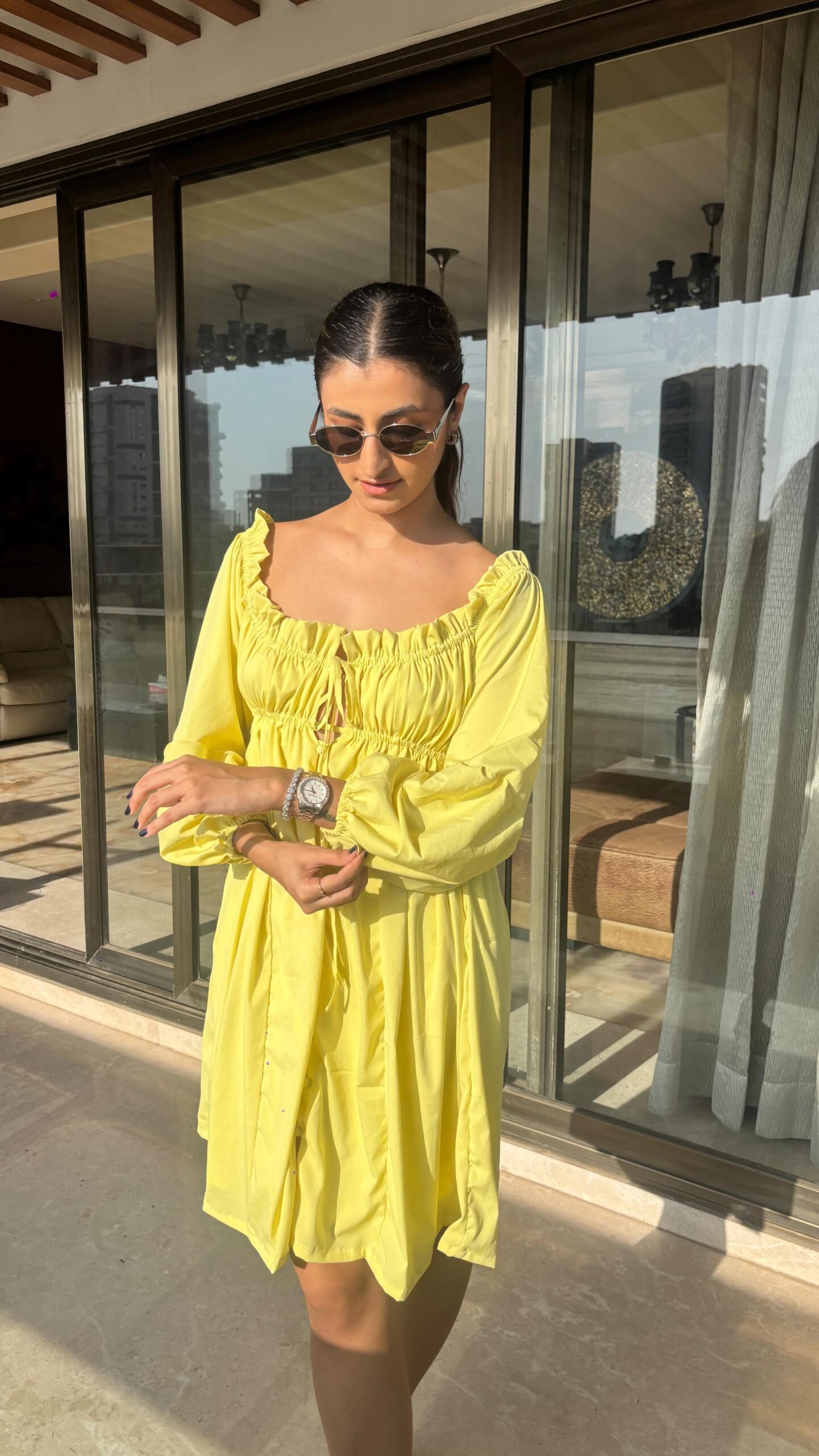 This playful yellow mini dress radiates sunny, carefree charm with its flowy silhouette and soft fabric. It features a ruched neckline with a delicate tie front, voluminous puff sleeves, and a line of buttons down the front for a vintage-inspired touch. The breezy fit makes it perfect for warm-weather outings—think beach days, brunch with friends, or summer festivals. Style it with white sneakers or strappy sandals, a straw hat, and a crossbody bag for an effortlessly chic daytime look.
