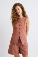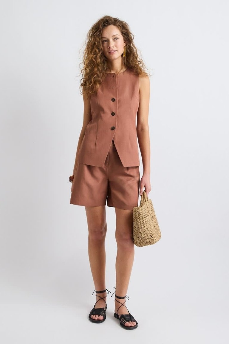 Long, fitted suit waistcoat in woven fabric with a round neckline and buttons at the front. Shaping darts at the waist, jetted front pockets, and a single back vent. Lined.