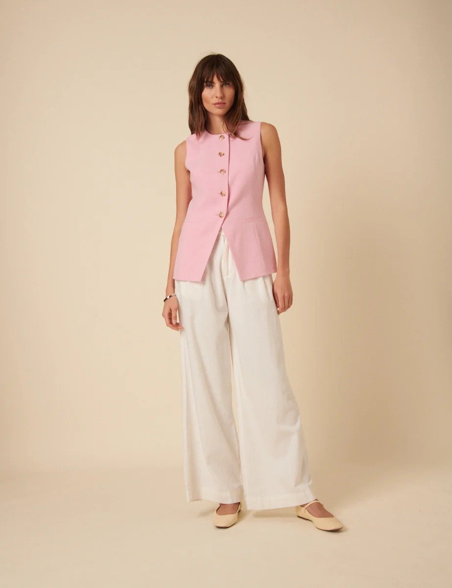 Long, fitted suit waistcoat in woven fabric with a round neckline and buttons at the front. Shaping darts at the waist, jetted front pockets, and a single back vent. Lined.