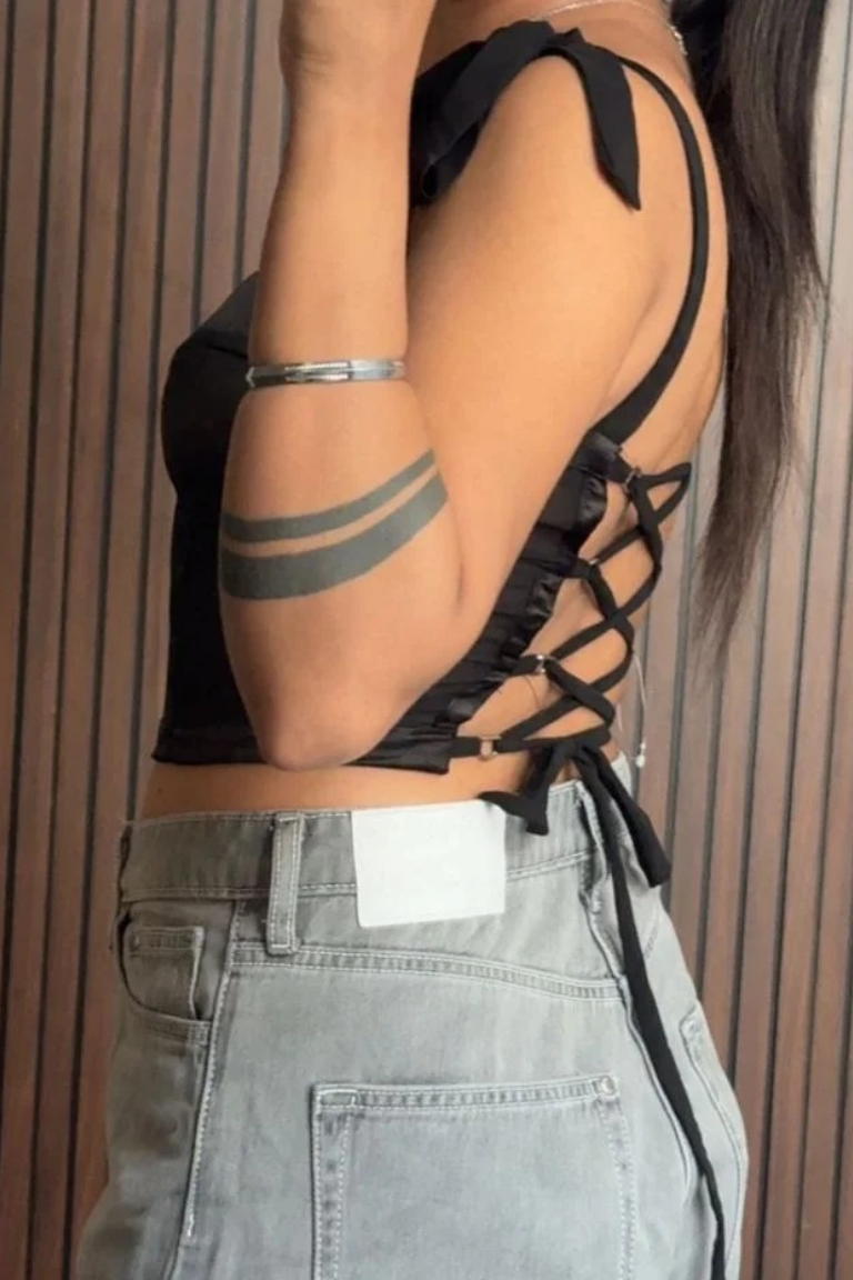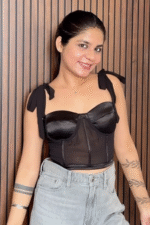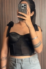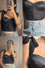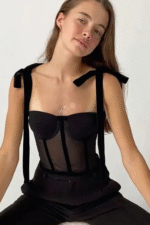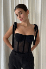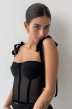 This black bustier top features sheer mesh panels, structured boning, and feminine velvet ribbon tie straps, blending elegance with a touch of edge. Perfect for date nights, parties, or evenings out, it can be styled with tailored trousers for a sleek look, jeans and a blazer for something casual, or a leather skirt and heels for a bold, night-out ensemble.
