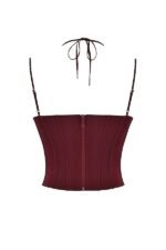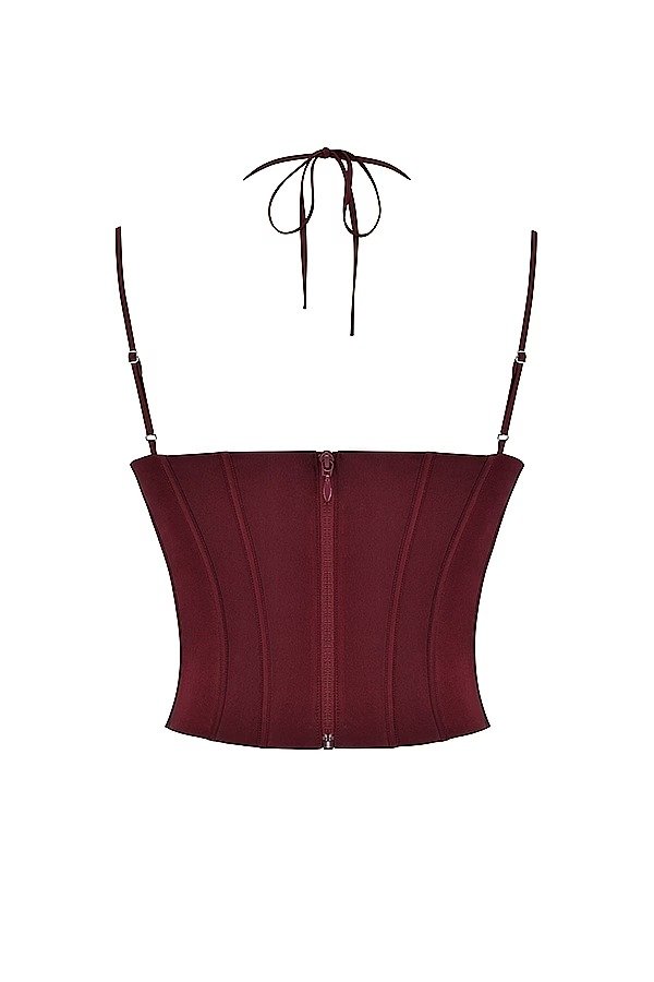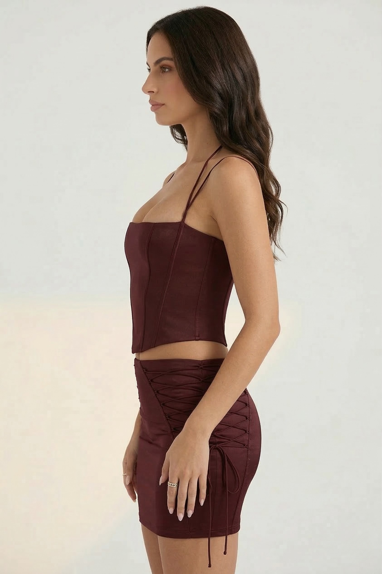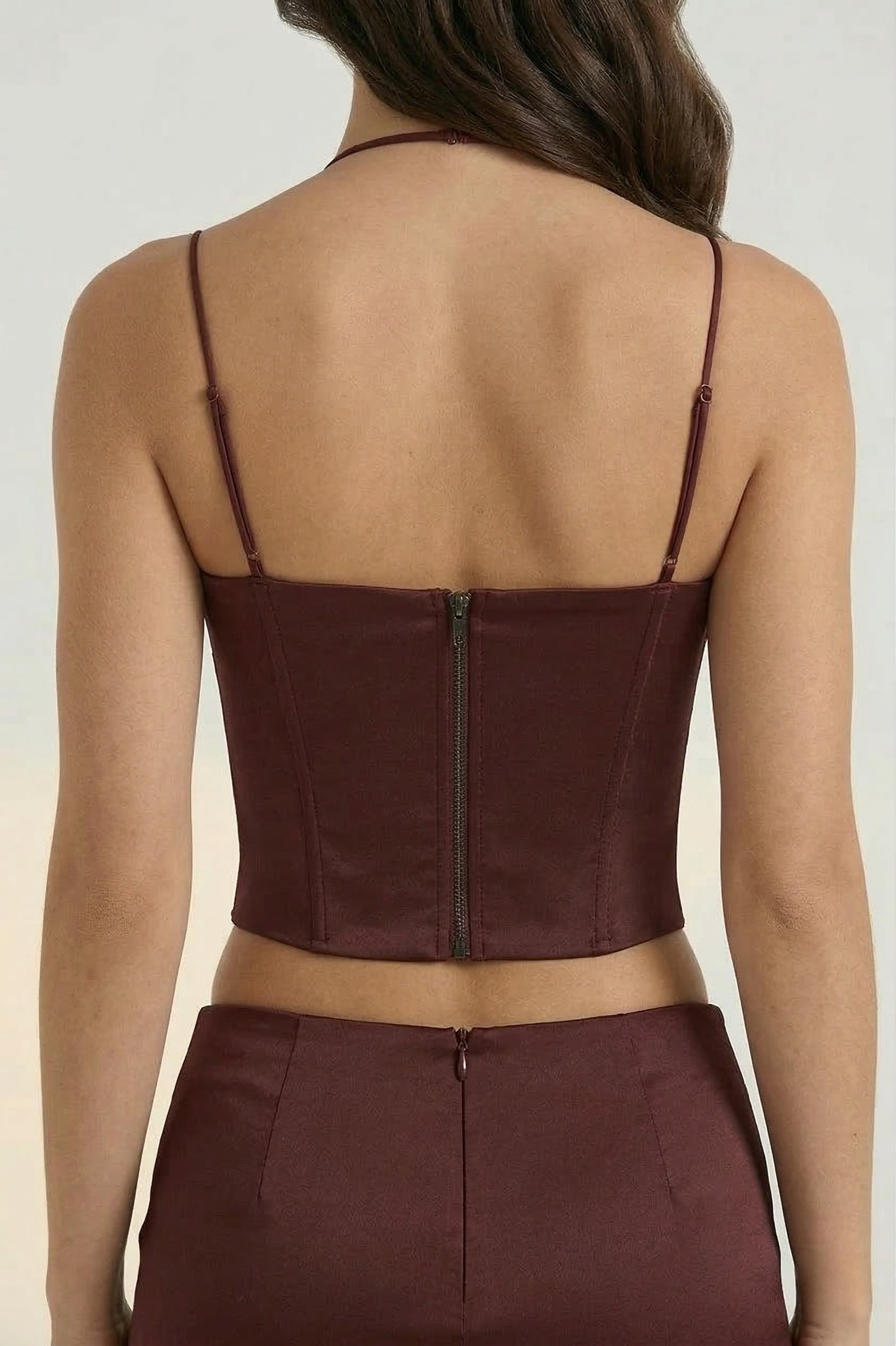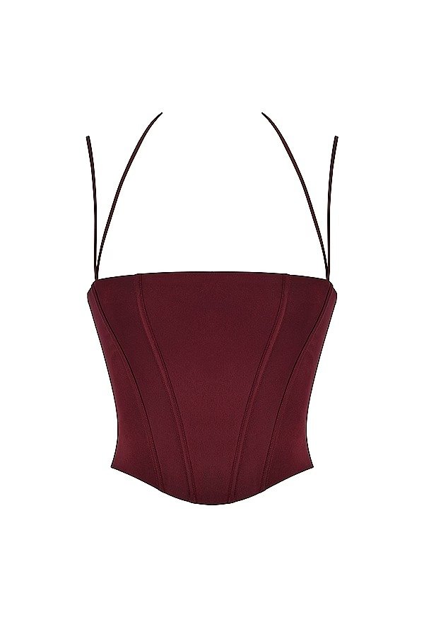 This deep maroon corset top features a structured bodice with vertical seam detailing and thin, adjustable straps for a sleek silhouette. Its form-fitting cut and slightly pointed hem enhance the waist, making it a bold and flattering choice for nights out, date nights, or stylish events. Pair it with a matching skirt, leather pants, or high-waisted trousers to complete the look.